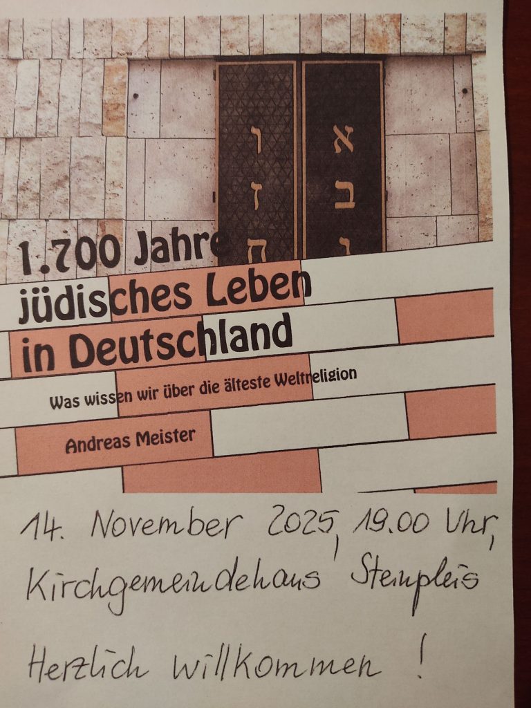 Im Rahmen der FriedensDekade 2025 lädt Andreas Meister (Vorsitzender der Gesellschaft für Christlich-Jüdische Zusammenarbeit Zwickau) zu einem Vortrag recht herzlich ein. Der Eintritt ist frei – um eine Kollekte wird gebeten.
